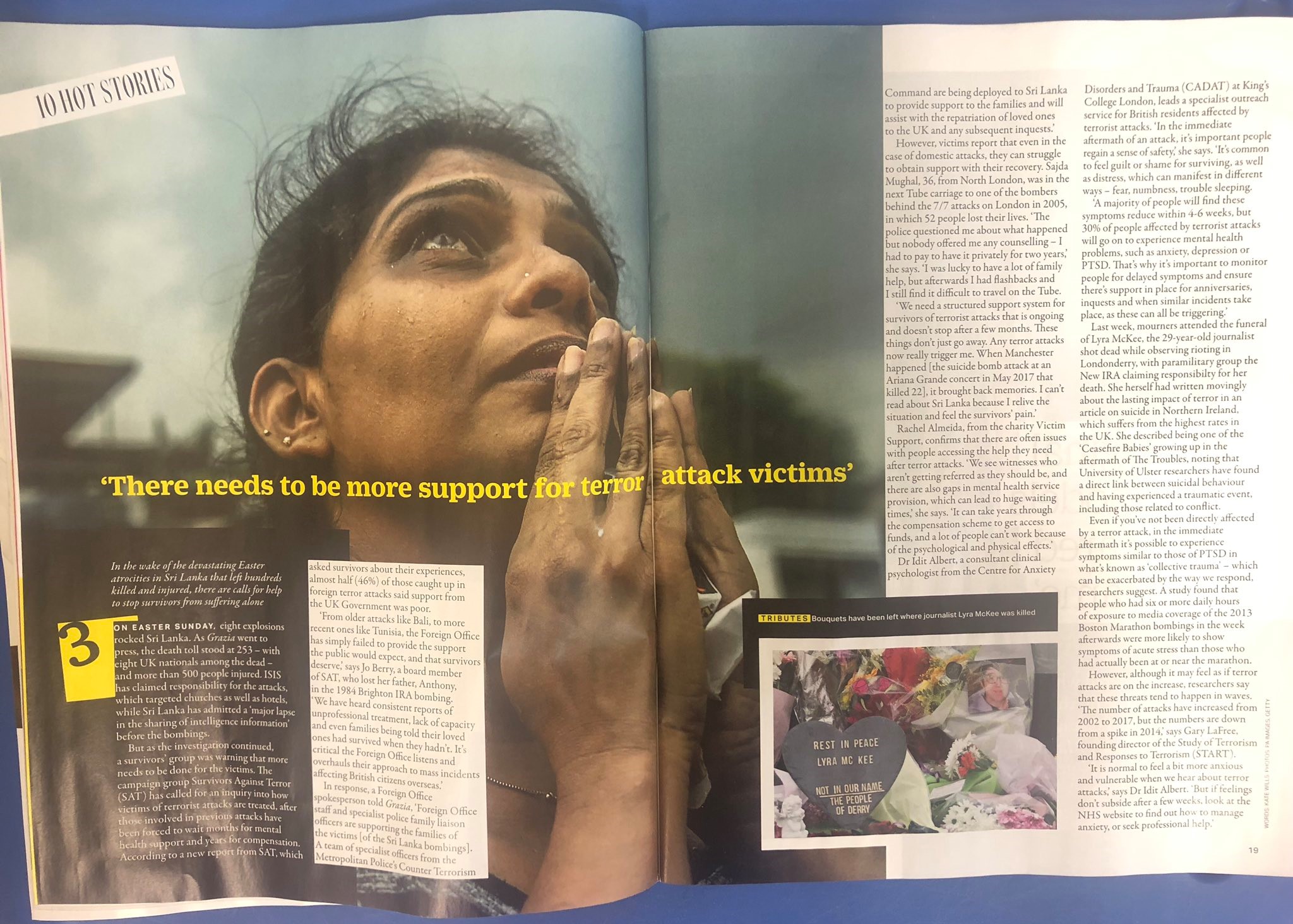 Our CEO Sajda has appeared in Grazia magazine to speak about the lack of support available for terror victims after her experience in the London bombings in 2005. This is in the wake of the Sri Lanka attack in which over 200 people died. Read the piece here.